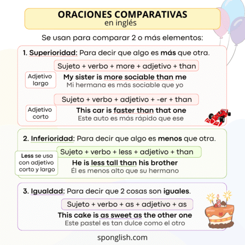 Las oraciones comparativas en inglés son esenciales para expresar diferencias entre cosas.Si entiendes cómo usar -er, more, less y as…as, podrás comunicarte de forma mucho más clara y natural.Si quieres practicar, revisa este artículo con Oraciones comparativas en inglés